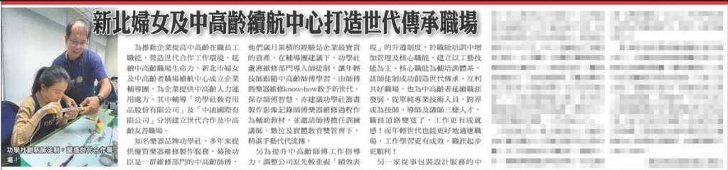 「功X社教育用品股份有限公司」係國內外知名樂器製造維修品牌,然如今隨著維修部門的老師傅年紀漸長,功X社也不斷思考如何做好經驗傳承,避免師傅退休後出現技術斷層危機。 對此,功X社導入「師徒制」方案,並建立經驗傳承的輔助教材,希冀透過老師傅帶領新技師,共同完成工作、促進傳承。 為使技術銜接、世代接班的任務精準到位,並激勵中高齡師傅延續職涯,功X社欲透過企業輔導方式,一方面優化輔助教材、促進老師傅技術傳承,另一方面則建立雙軌升遷制度,以升遷獎勵鼓勵中高齡員工職場續航。